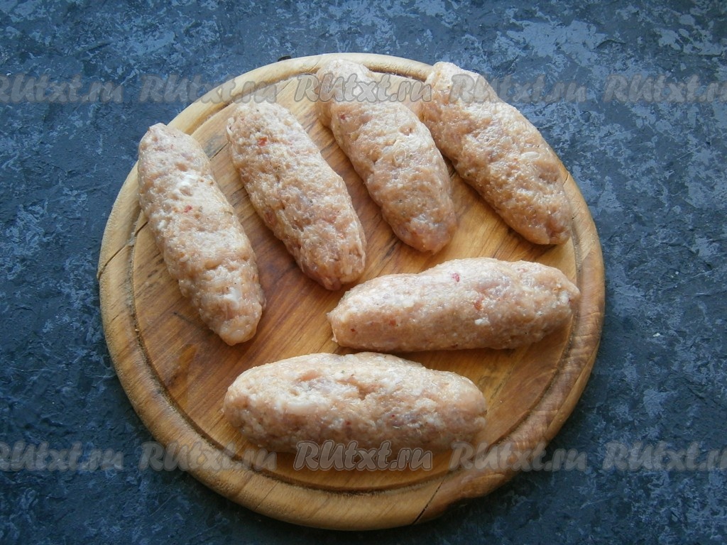 Далее фарш нужно вымешивать еще минут 5-6, чтобы он стал вязким и липким. Поместить фарш в холодильник на 2 часа, а затем влажными руками сформировать продолговатые люля-кебабы.