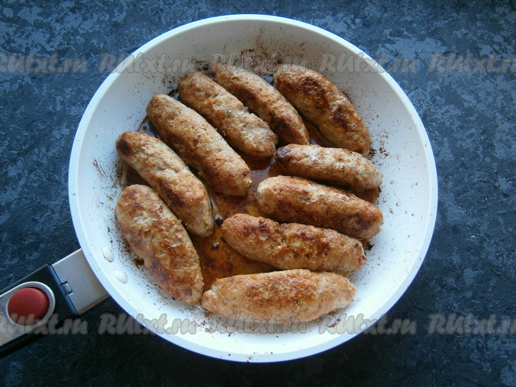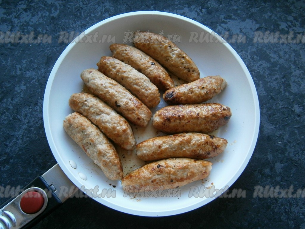 Затем огонь уменьшить до минимального и обжаривать мясные трубки далее, периодически их переворачивая, минут 10-15, не накрывая сковороду крышкой.