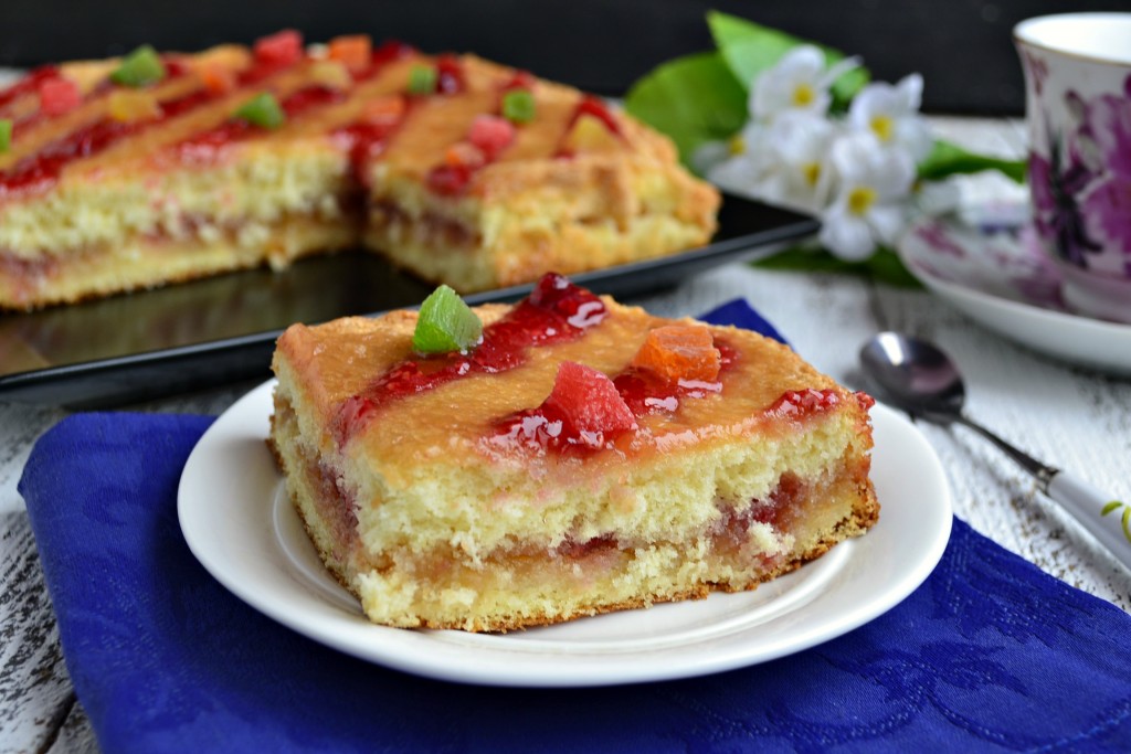 Простой, сочный и очень вкусный бисквитный пирог с вареньем можно сразу подавать к столу, а можно поместить хотя бы на час-два в холодильник - он станет еще более вкусным и нежным.