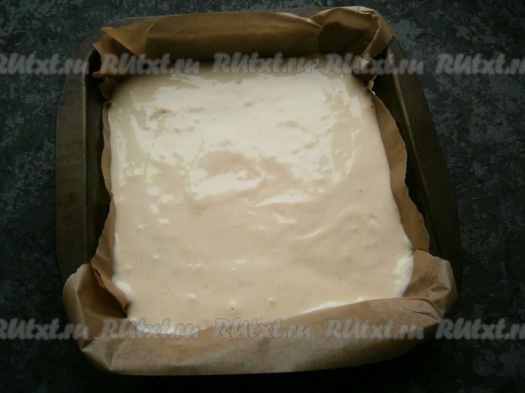 Квадратную или прямоугольную форму (у меня форма размером 23х23 см) застелить пергаментом (можно только дно), выложить тесто, разровнять его и пару раз, без фанатизма, стукнуть дном формы об стол (чтобы тесто равномерно распределилось по дну формы).