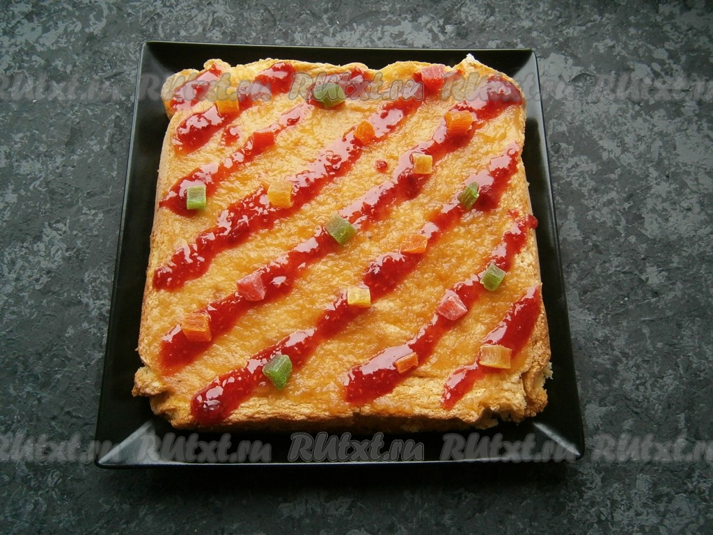 Поверх смазанной половины бисквита выложить вторую часть бисквита, верх также смазать вареньем и украсить цукатами.