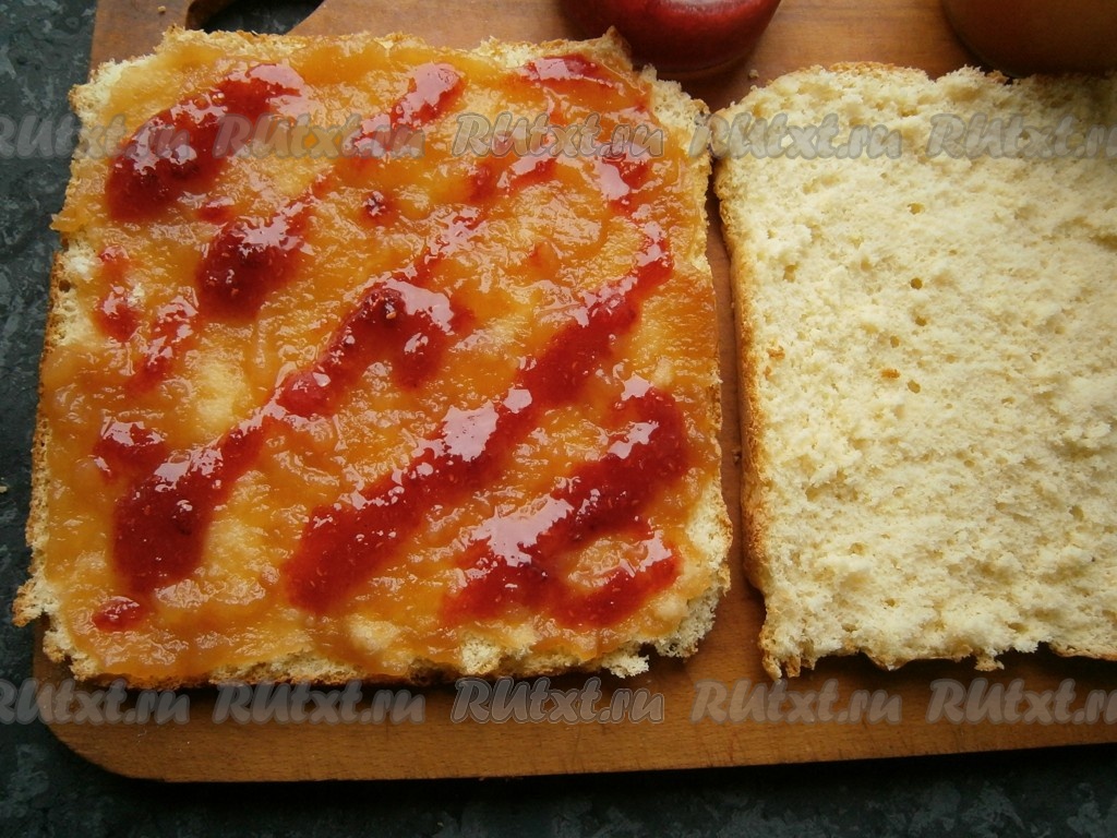После "отлежки" бисквит станет плотнее, его можно будет разрезать. Бисквит, замешанный на 3 яйцах, можно ничем не пропитывать. По желанию, бисквит можно посыпать сахарной пудрой, нарезать и подать к чаю. Я предлагаю приготовить из такого бисквита очень простой и вкусный пирог с вареньем. Для этого бисквит нужно разрезать горизонтально на 2 части. Смазать одну половину бисквита вареньем (я смазала его не слишком густым яблочным вареньем и нанесла немного малинового варенья (как на фото)).