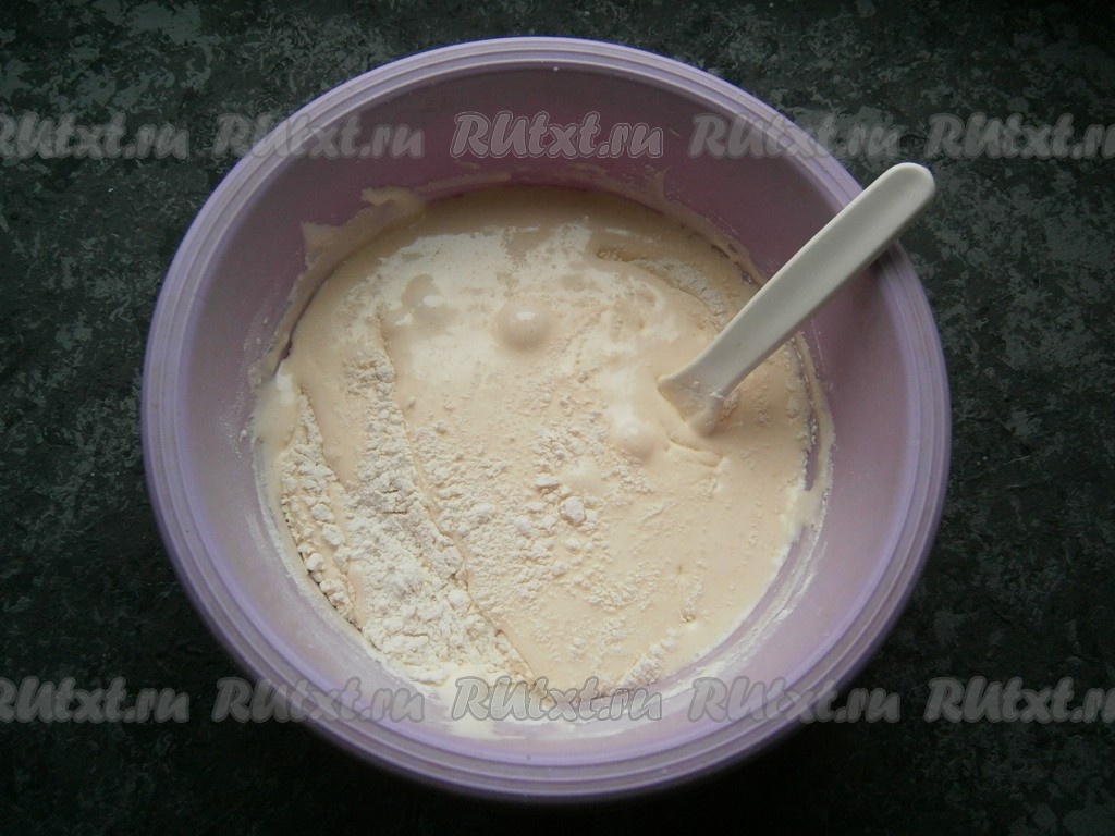 Частями всыпать просеянную с разрыхлителем муку, каждый раз ее аккуратно вмешивая ложкой в яичную смесь.