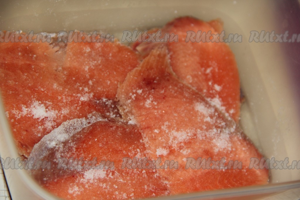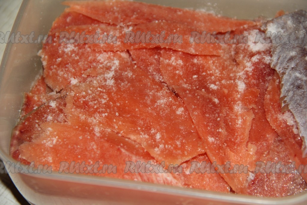 Таким образом выкладывать ломтики филе красной рыбки слоями, присаливая каждый слой.