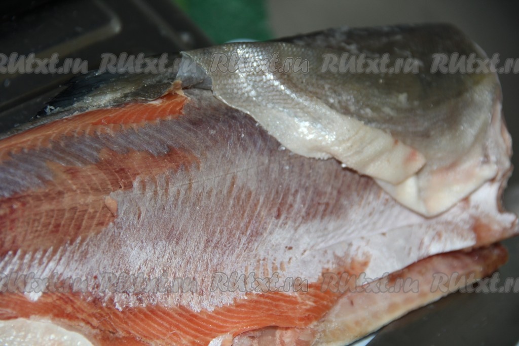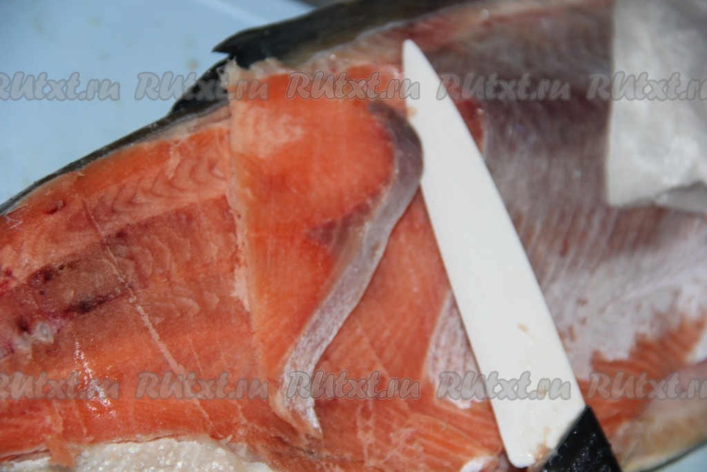Отрезать голову и хвост горбуши. Снять шкурку. Если рыба не полностью разморожена, то шкурка снимается ровно (чулком).
