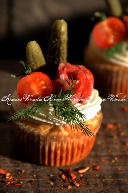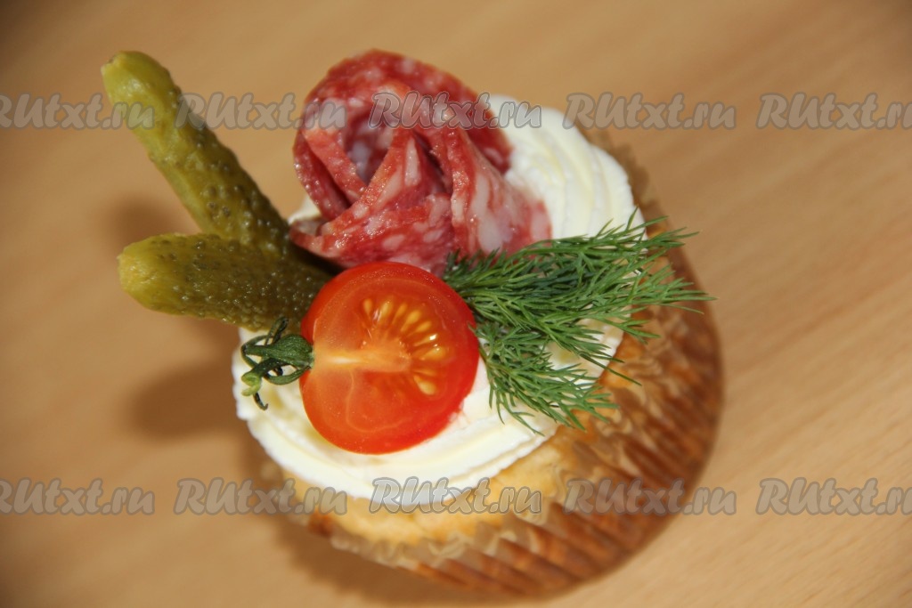 Отсадить творожный сыр на кексы. Украсить по своему вкусу (я украсила розочками из колбаски, зеленью, маленькими огурчиками и половинками помидоров черри).