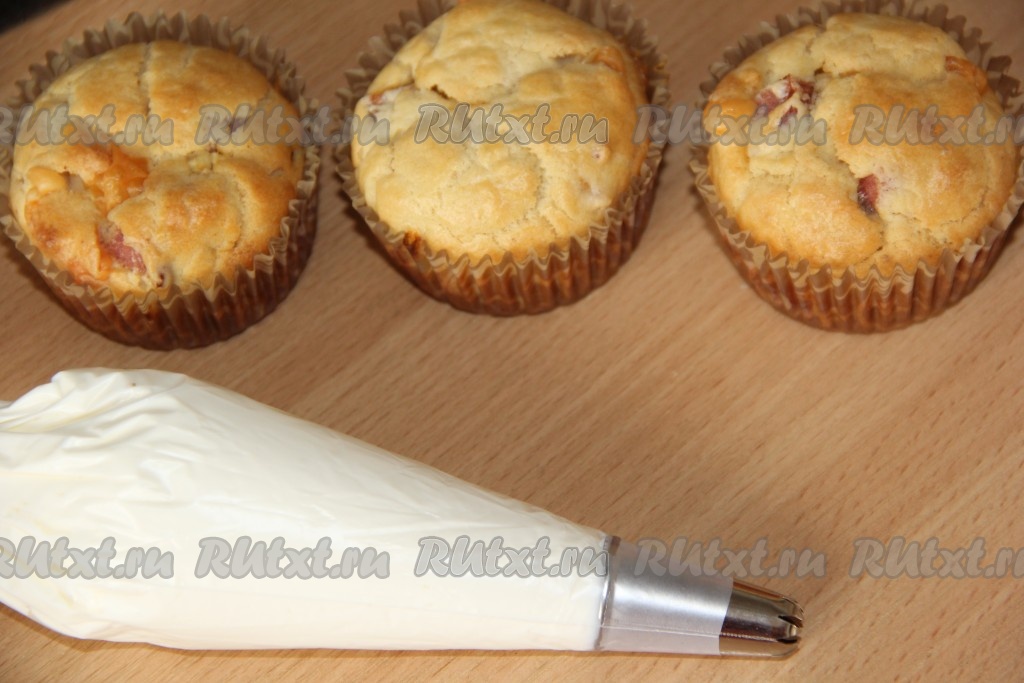 Выпекать закусочные кексы в разогретой духовке, примерно, 30 минут при температуре 200 градусов. Кексики во время выпекания поднимутся, но когда остынут, немного опадут. Тёплые кексы с сыром и ветчиной можно подавать к столу. Я решила их украсить творожным сыром, колбасой и овощами.