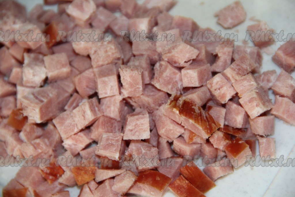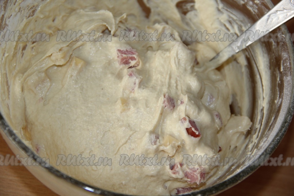 Добавить сыр и ветчину в тесто, хорошо перемешать ложкой.
