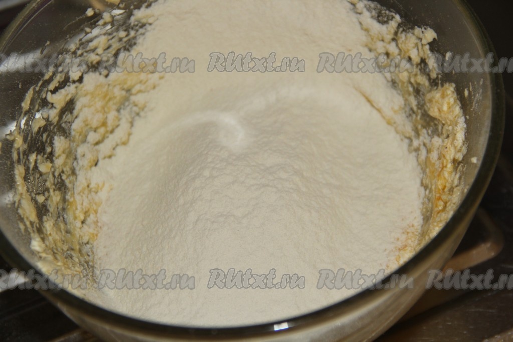 Затем всыпать, примерно, 100 грамм просеянной муки и разрыхлитель.