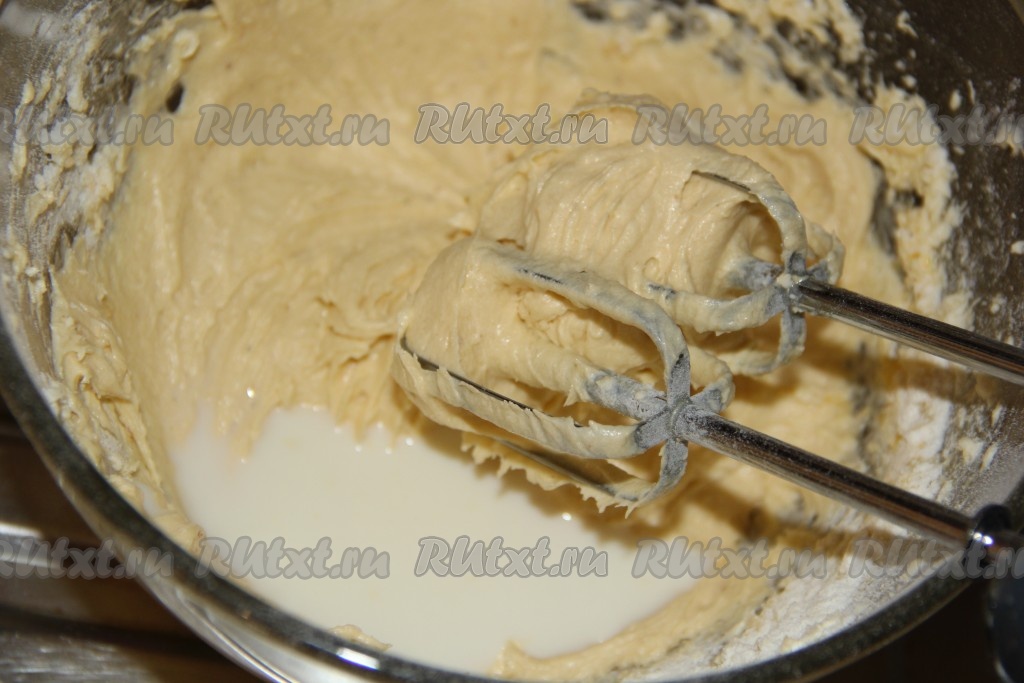 Перемешать на низких оборотах миксера и влить 60 мл молока, ещё раз перемешать.
