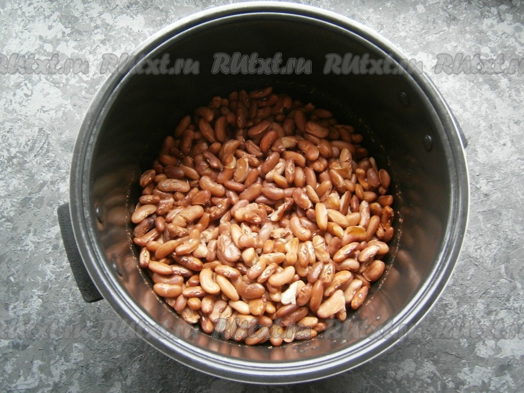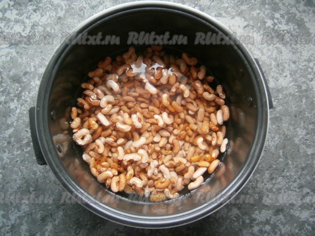 Высыпать фасоль в чашу мультиварки, влить 1,8 литра очищенной воды комнатной температуры.