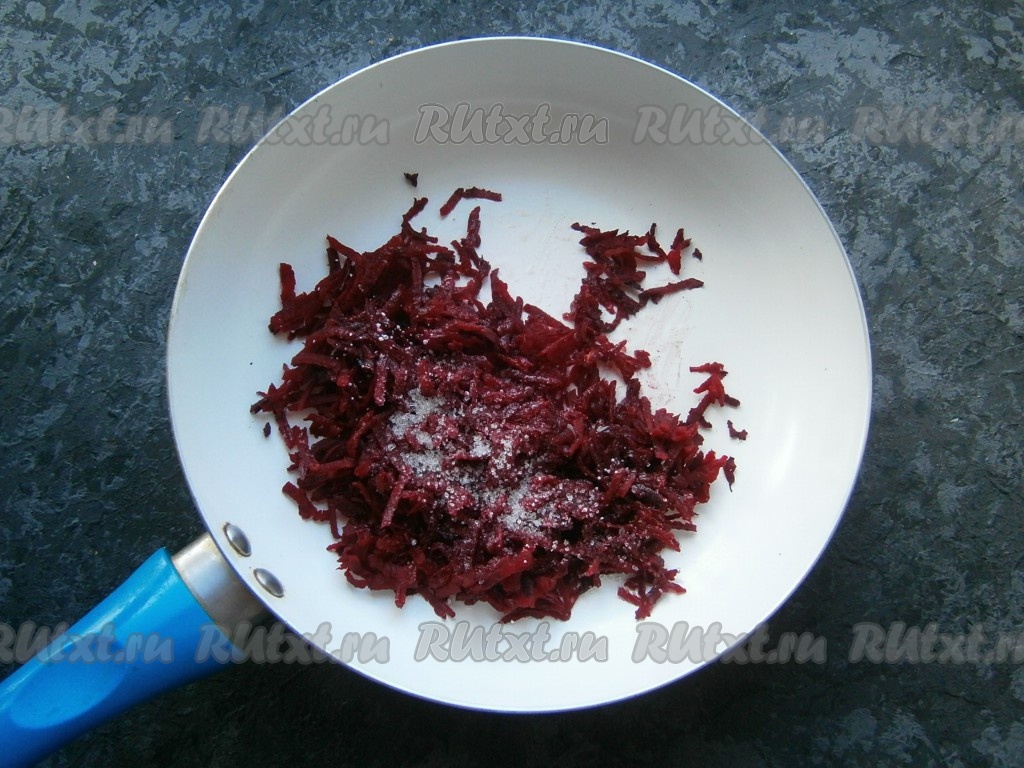 Свеклу натереть на крупной терке, выложить в сковороду, влить 1 столовую ложку растительного масла. Посыпать свеклу сахаром и добавить щепотку лимонной кислоты.