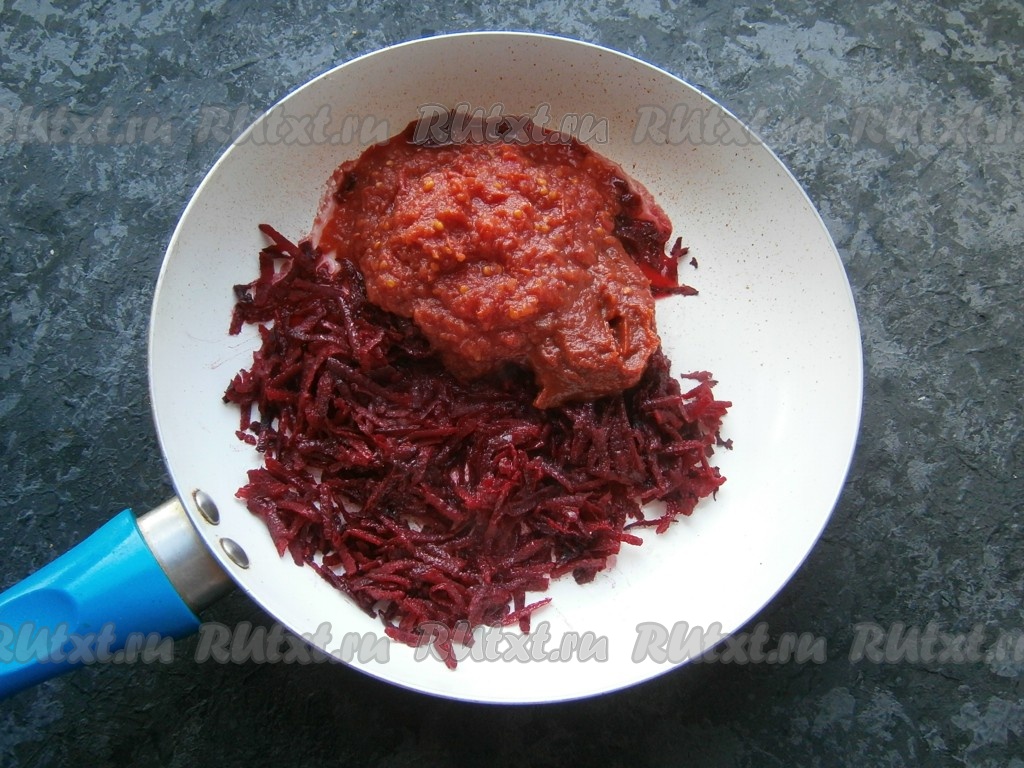 Добавить томат и томатную пасту, влить 150 мл горячей воды, перемешать и, помешивая, протушить свеклу 4-5 минут на медленном огне.