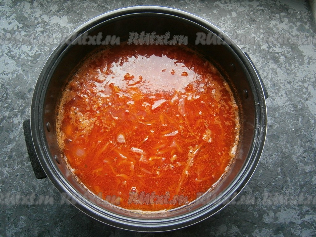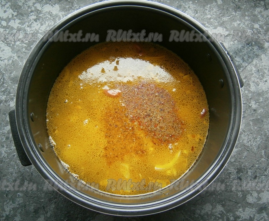 Влить воду, добавить соль и специи, выставить программу "Суп" на 1 час, крышку мультиварки закрыть.