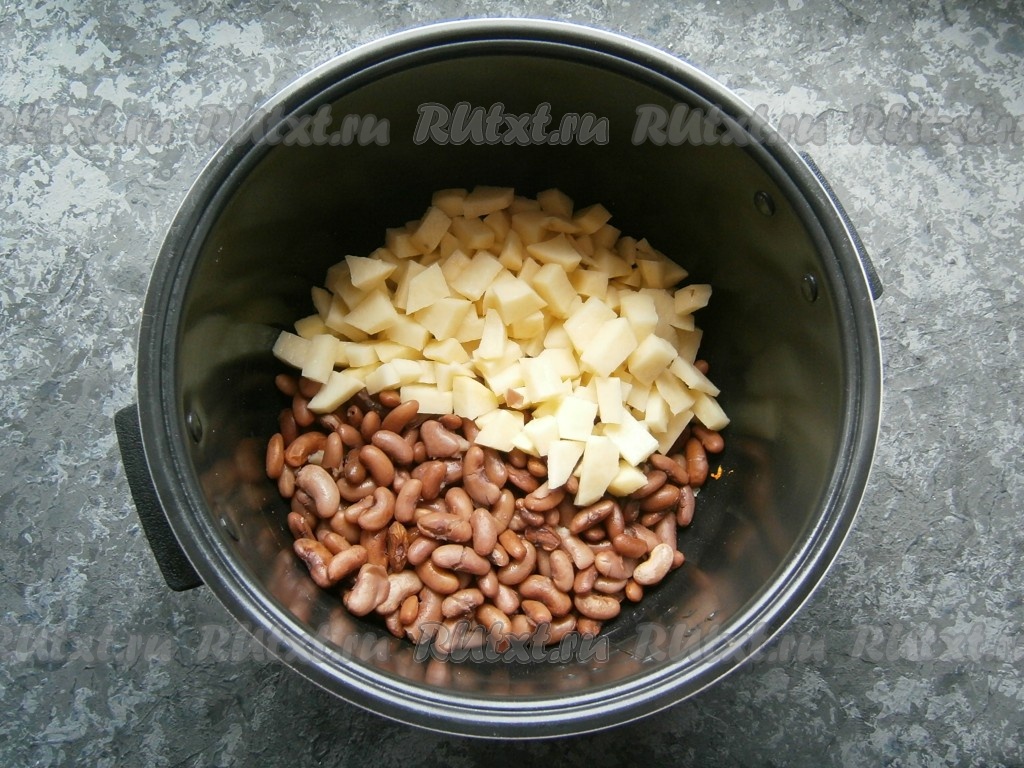Затем добавить в чашу нарезанный небольшими кусочками картофель и всыпать вареную фасоль.