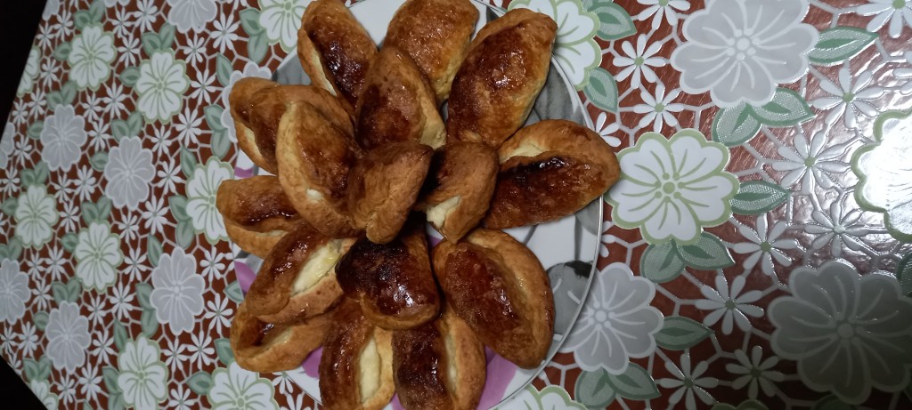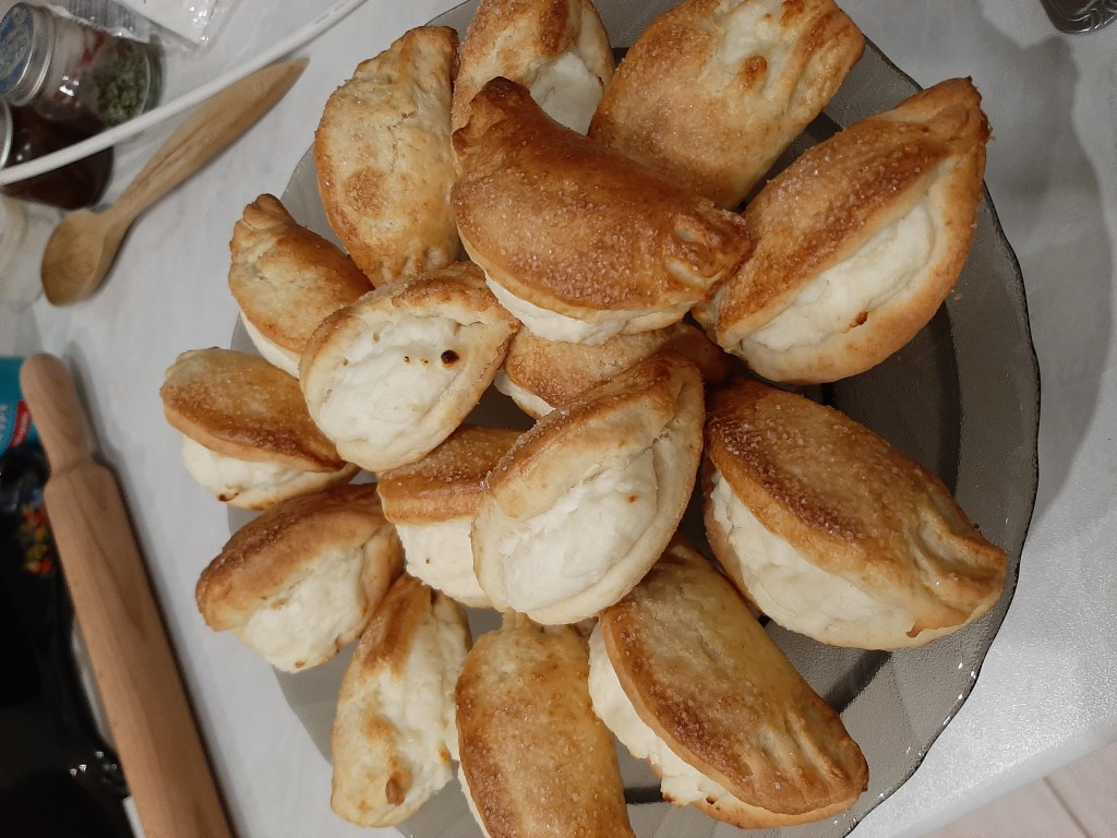 Далее формируем сочники с творогом, для этого накрываем творожную начинку свободной стороной теста и защипываем края теста, оставляя серединку открытой (как на фото).