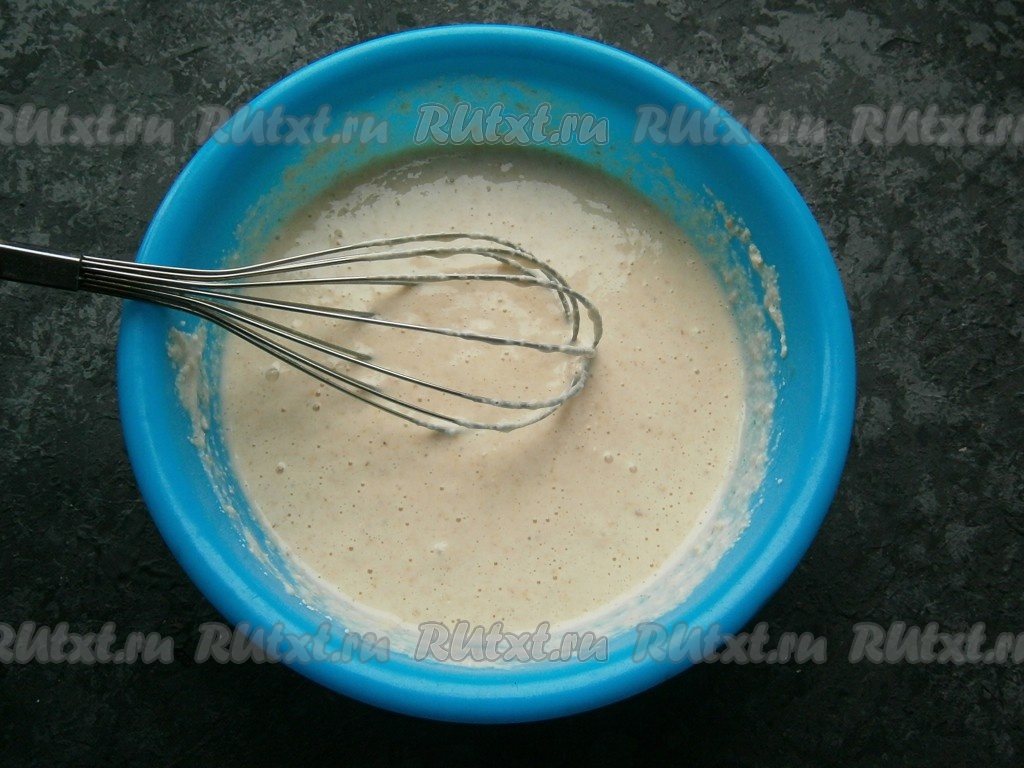 Далее добавить сырые яйца, соду, сахар, влить растительное масло, перемешать венчиком. Тесто получится не жидким, но и не густым.