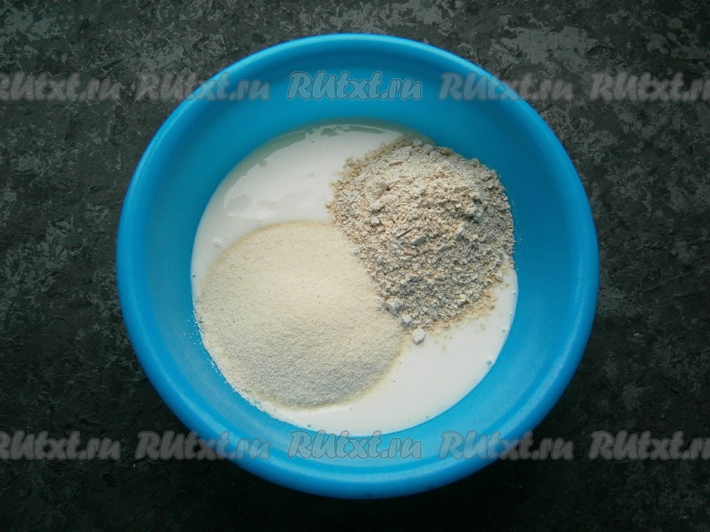 Кефир комнатной температуры налить в миску, всыпать овсяную крошку и манную крупу, добавить щепотку соли.