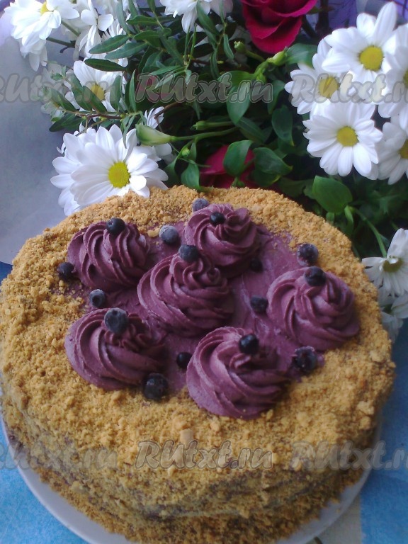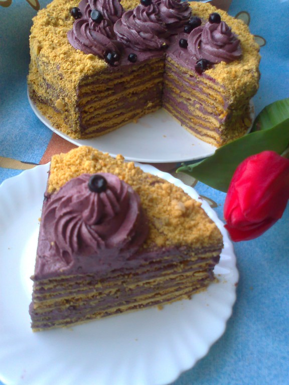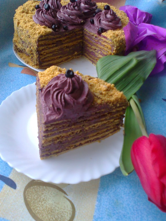 Этот необычный медовый торт "Кадриль" с черничным кремом увидела у Зарины. Замечательный разрез и черника в креме привлекли мое внимание. Очень захотелось попробовать и в результате - отличный вкус, нежные коржи, красивый разрез. Надеюсь, понравится и вам!