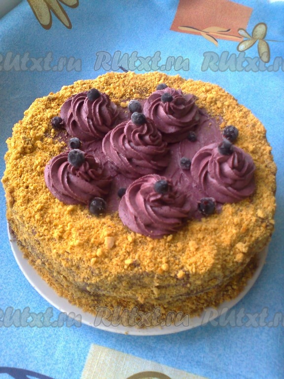 Края и бока торта обсыпать крошкой. Сверху украсить с помощью кондитерского мешка и насадки узором из отложенного крема, ягодами черники. Дать торту пропитаться в течение хотя бы 2 часов, в идеале - 12 часов.