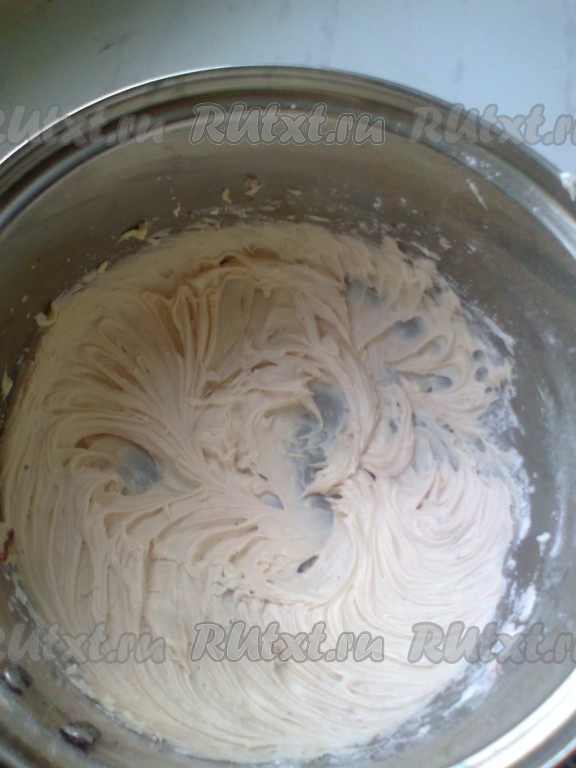 Накрыть заварной крем пленкой. Пленка должна плотно прилегать к поверхности крема, чтобы он не заветрился. Охладить крем до комнатной температуры, не убирая в холод. Мягкое сливочное масло комнатной температуры взбить миксером с 50 граммами сахарной пудры до пышного состояния.