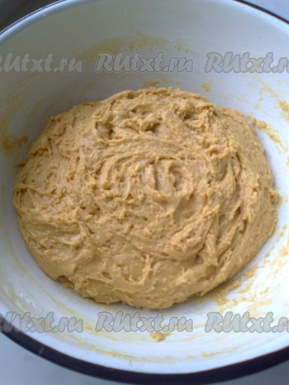 В получившуюся массу всыпать просеянную муку, замешивая тесто деревянной лопаткой. Тесто получится вязким.