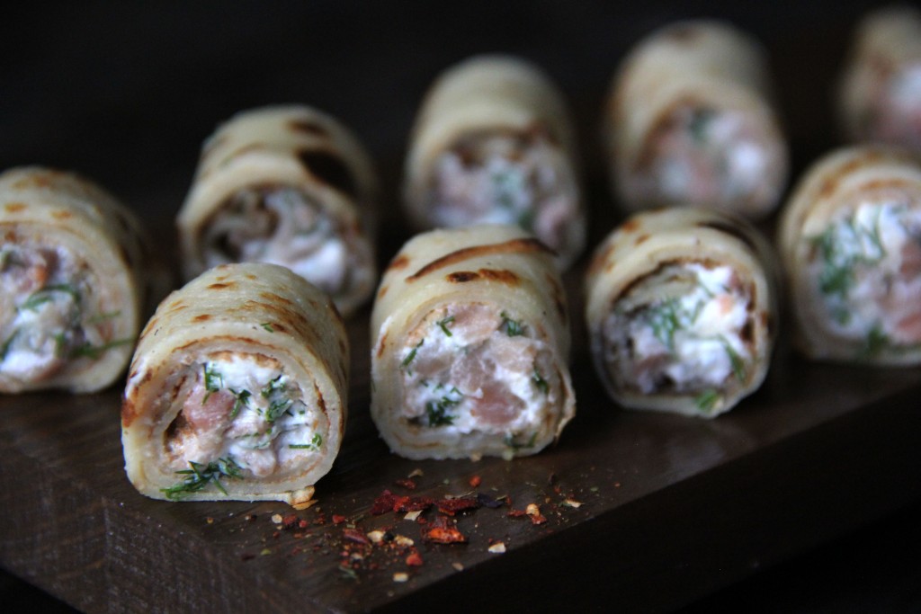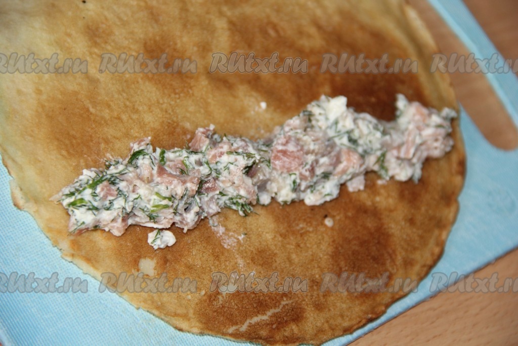 Блинчики остудить. Соединить красную рыбу, зелень и творожный сыр, тщательно перемешать и начинка для роллов из блинов готова.