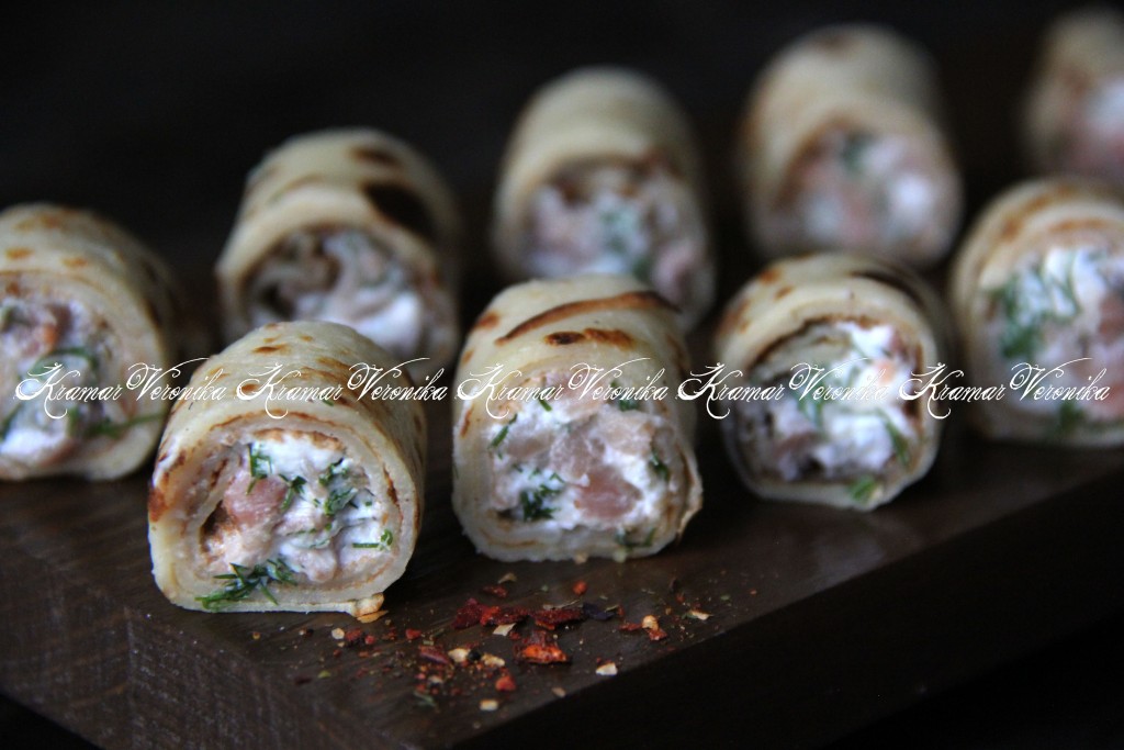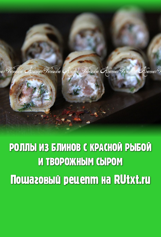 В качестве начинки для роллов из блинов я использовала слабосолёную красную рыбу (у меня - горбуша) и творожный сливочный сыр.