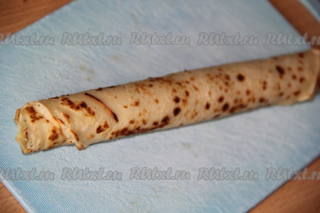 Свернуть блинчик с начинкой в плотный рулет, начиная со стороны с начинкой.
