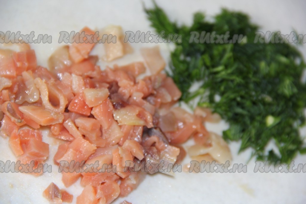 Рыбу нарезать на мелкие кусочки, удаляя косточки. Укроп вымыть, а затем обсушить и мелко нарезать.