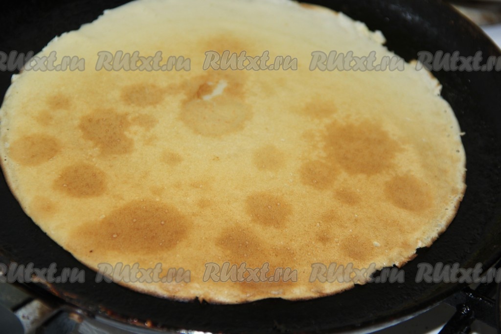 Сковороду хорошо прогреть, немного смазать маслом, вылить половник теста, быстро распределяя тесто по дну сковородки. На среднем огне жарить блин до золотистости с двух сторон. Блинчики, приготовленные по этому рецепту, получаются тонкими, они отлично переворачиваются. Готовый блин переложить на тарелку. Постепенно пожарить все блины, складывая их горкой на тарелку. Сковороду я смазывала маслом только перед жаркой первого блина, но многое зависит от качества покрытия вашей блинной сковородки, поэтому, если будет необходимость, периодически слегка смазывайте её маслом. Тесто, чтобы оно не застаивалось, нужно перемешивать перед жаркой очередного блина.