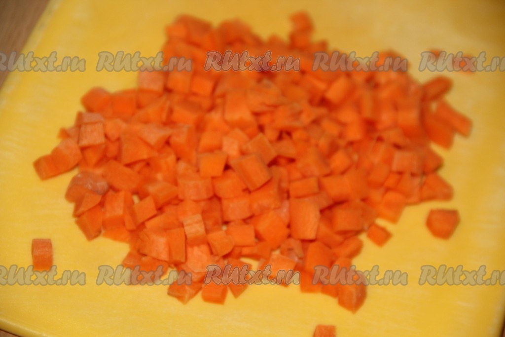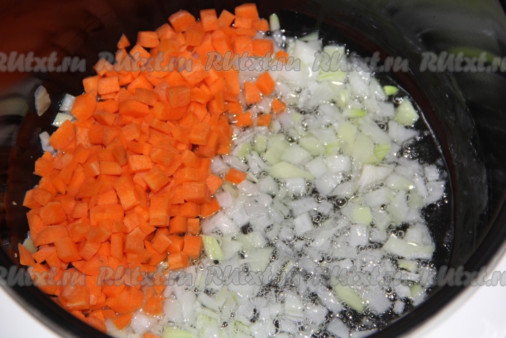 Когда лук обжарится в течение 5 минут, выложить к нему кубики моркови и обжарить, помешивая, в течение 5-7 минут на режиме "Жарка".