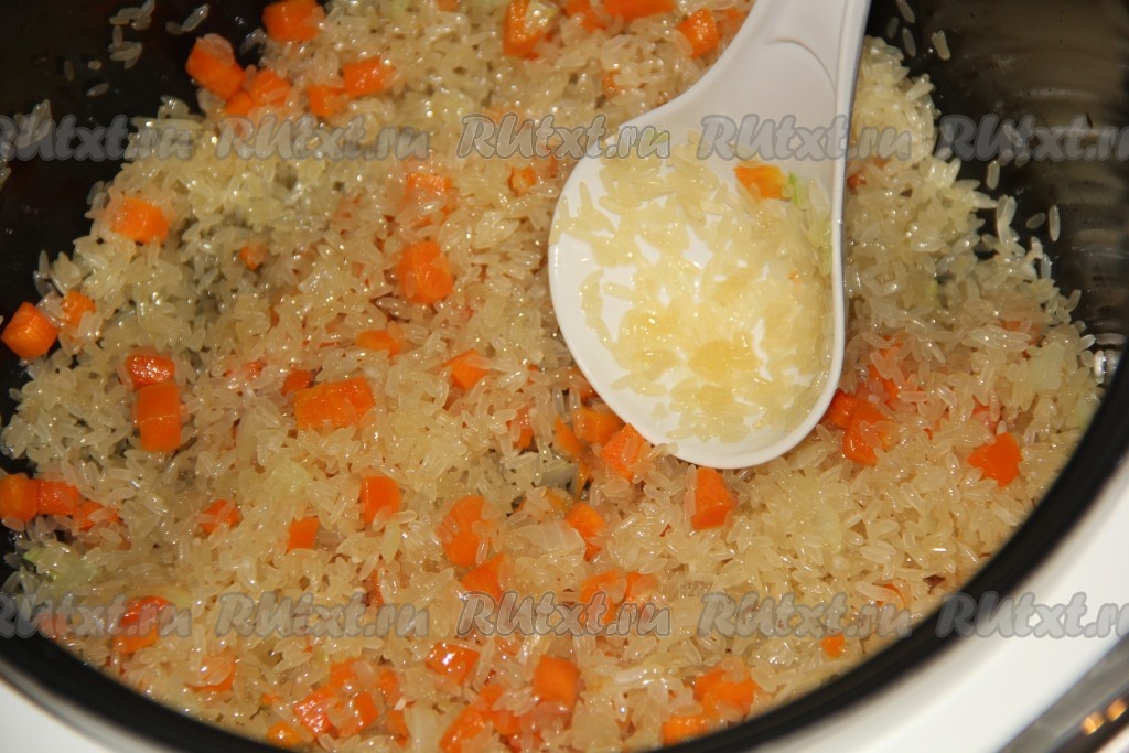 Обжарить рис с овощами в течение 2-3 минут, помешивая.