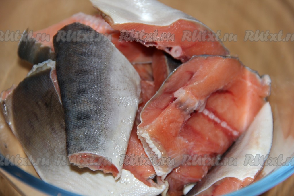 Горбушу вымыть под проточной водой, удалить голову, внутренности и хвост. Нарезать рубку на порционные кусочки (я косточки не удаляла).
