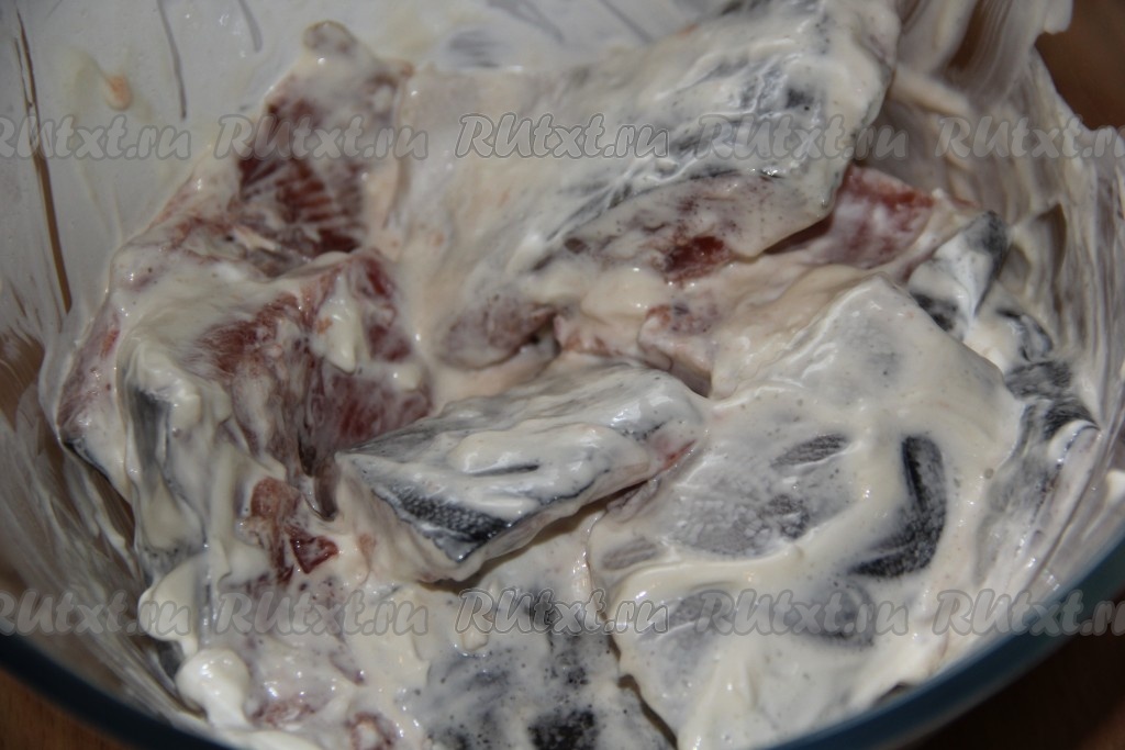 Добавить к кусочкам горбуши майонез и хорошо перемешать.