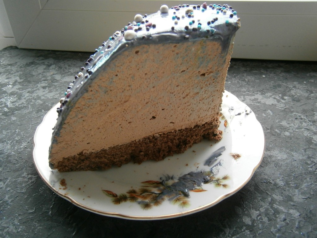 Готовый нежный и очень вкусный шоколадный муссовый торт разрезать на части с помощью ножа, лезвие которого нужно нагреть на огне, чтобы глазурь за ножом не тянулась.