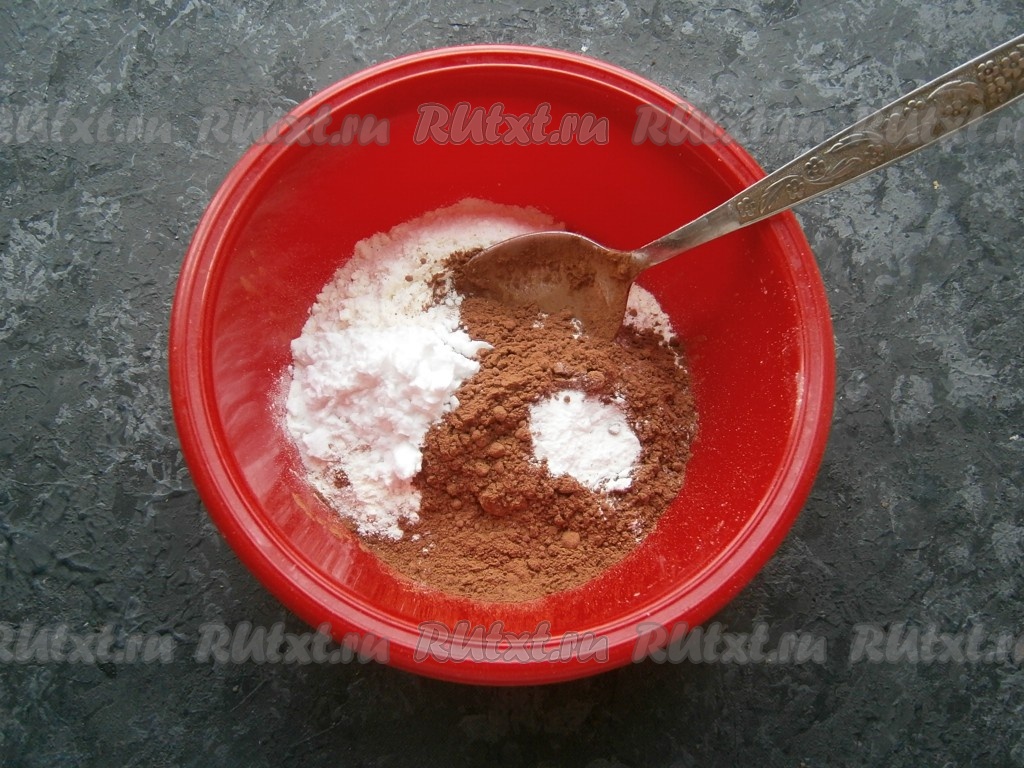 Отдельно смешать муку с какао-порошком, крахмалом и разрыхлителем.