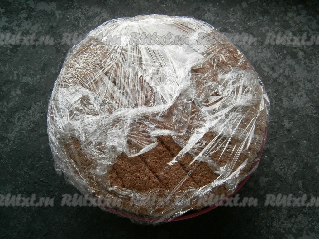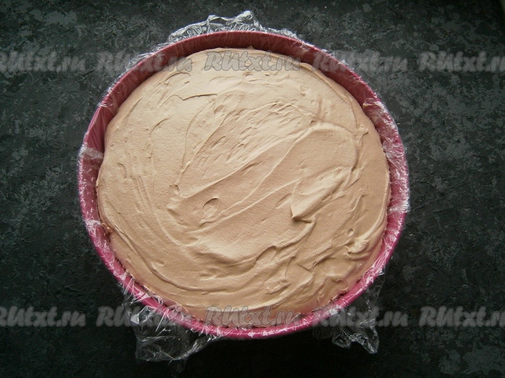 Прикрыть всё краями пищевой пленки и отправить шоколадный муссовый торт в морозильную камеру на 6-8 часов (лучше на ночь).