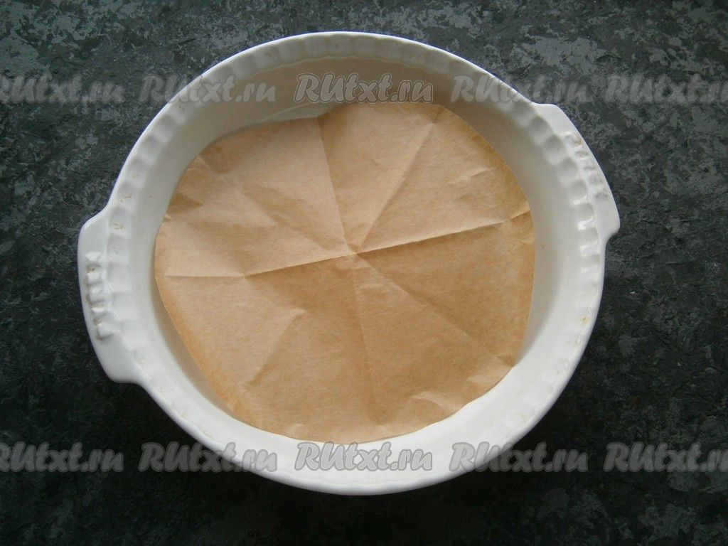 Теперь нужно взять форму для выпечки, по диаметру схожую с верхней (самой широкой) частью полукруглой формы, в которой вы будете готовить торт. У меня форма диаметром 23-24 см. Дно формы застелить пергаментом. Форма может быть невысокой, бисквит у нас получится тонким.
