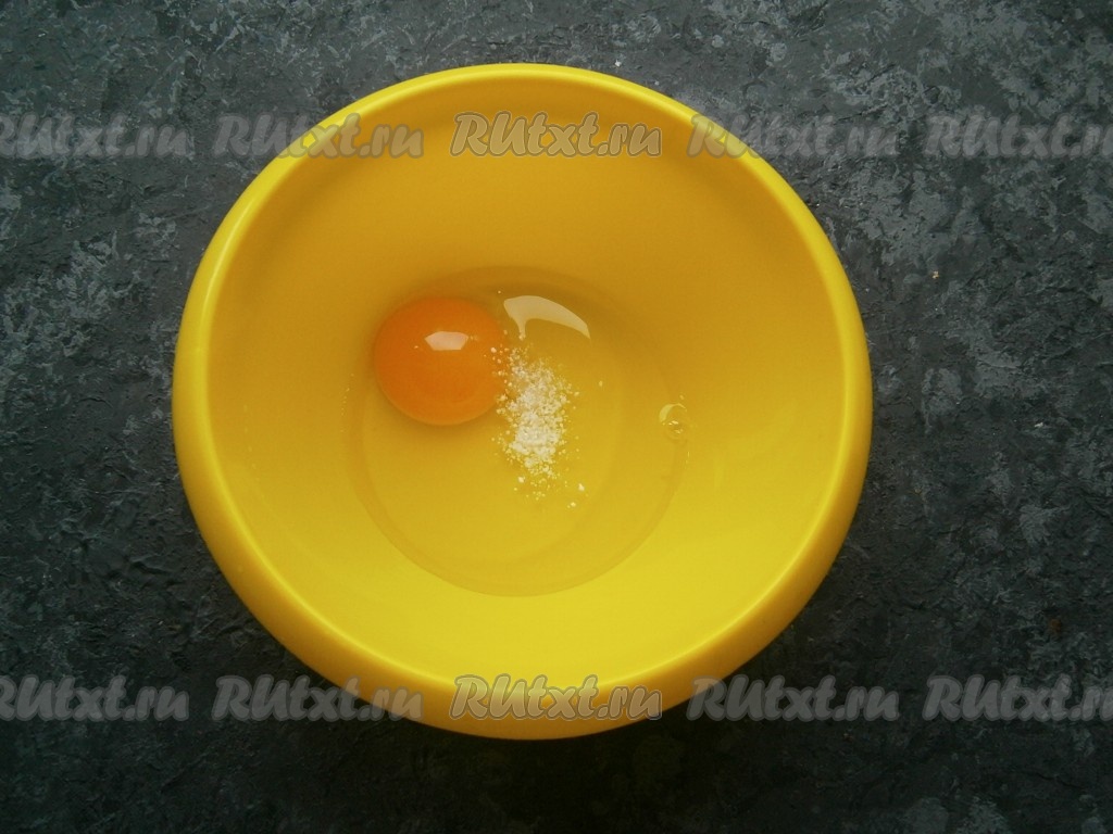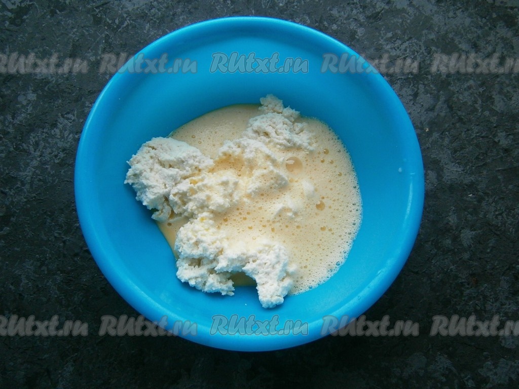 Взбить яйцо миксером до пышной пены. Творог переложить в миску, добавить взбитое яйцо.