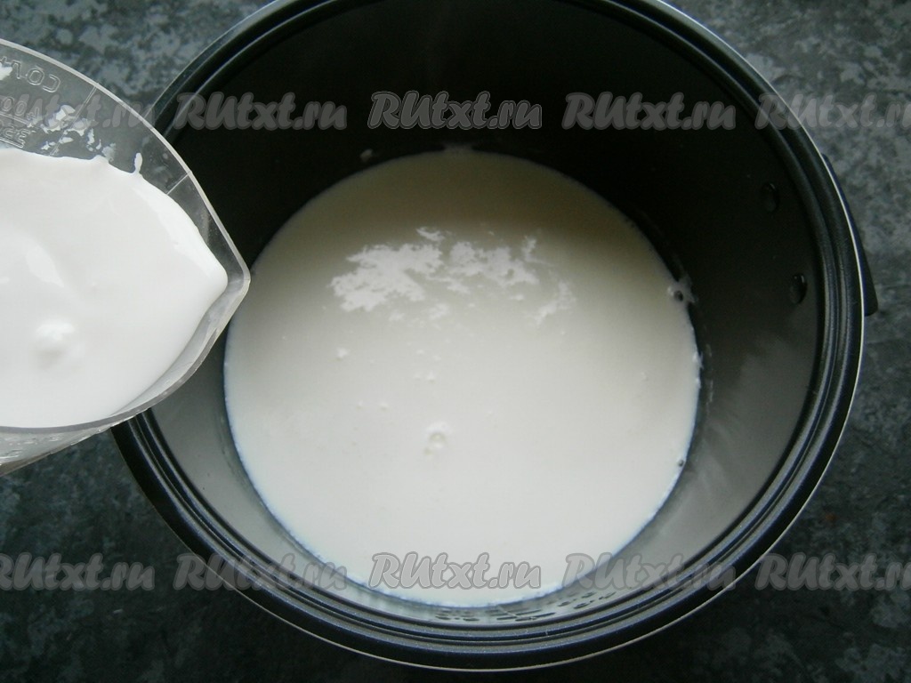 Довести молоко до кипения, периодически его помешивая, крышку мультиварки не закрывать. Как только молоко начнет закипать, мультиварку выключить и влить кефир, аккуратно перемешать.