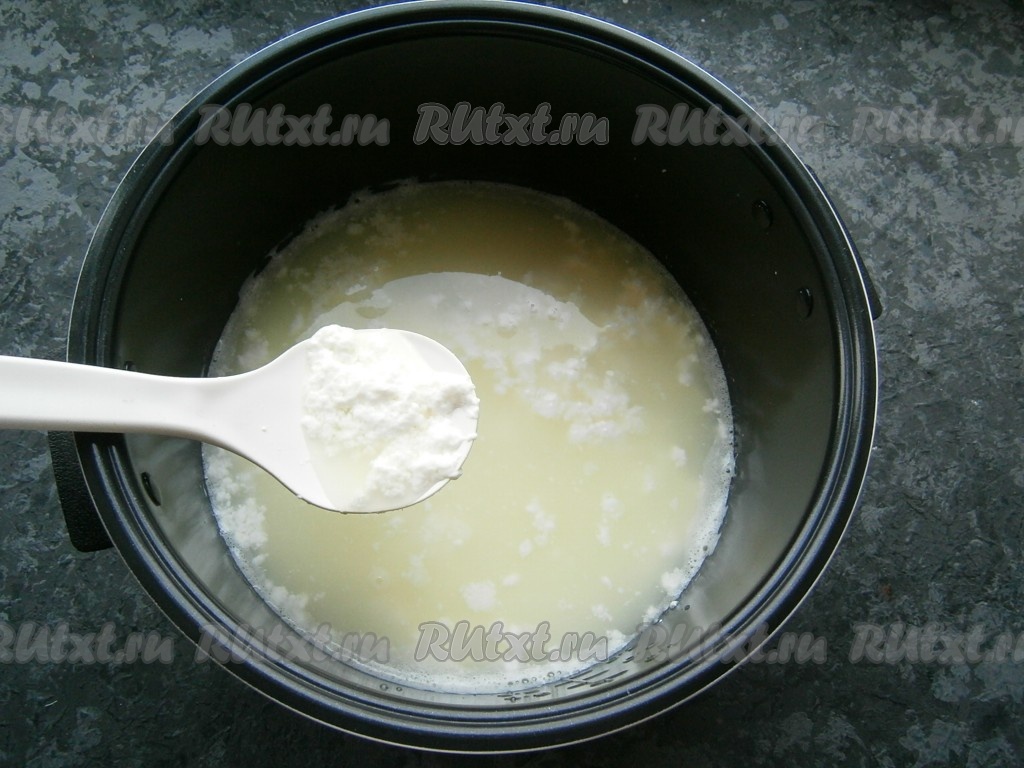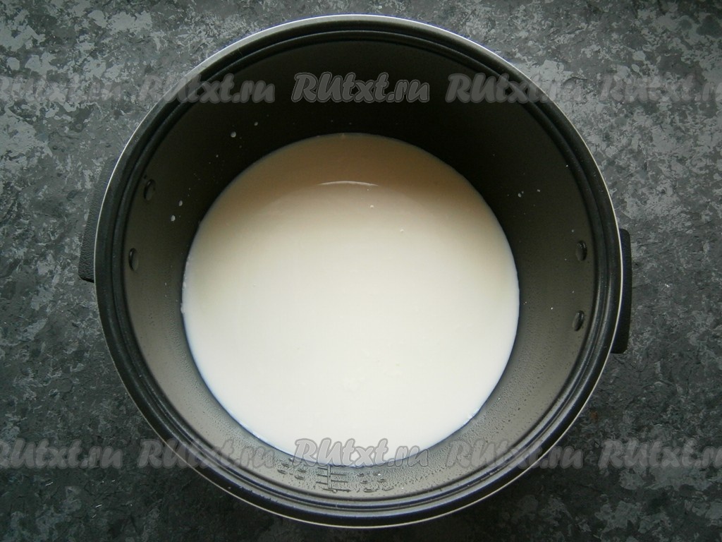 Молоко налить в чашу мультиварки, всыпать соль и сахар.