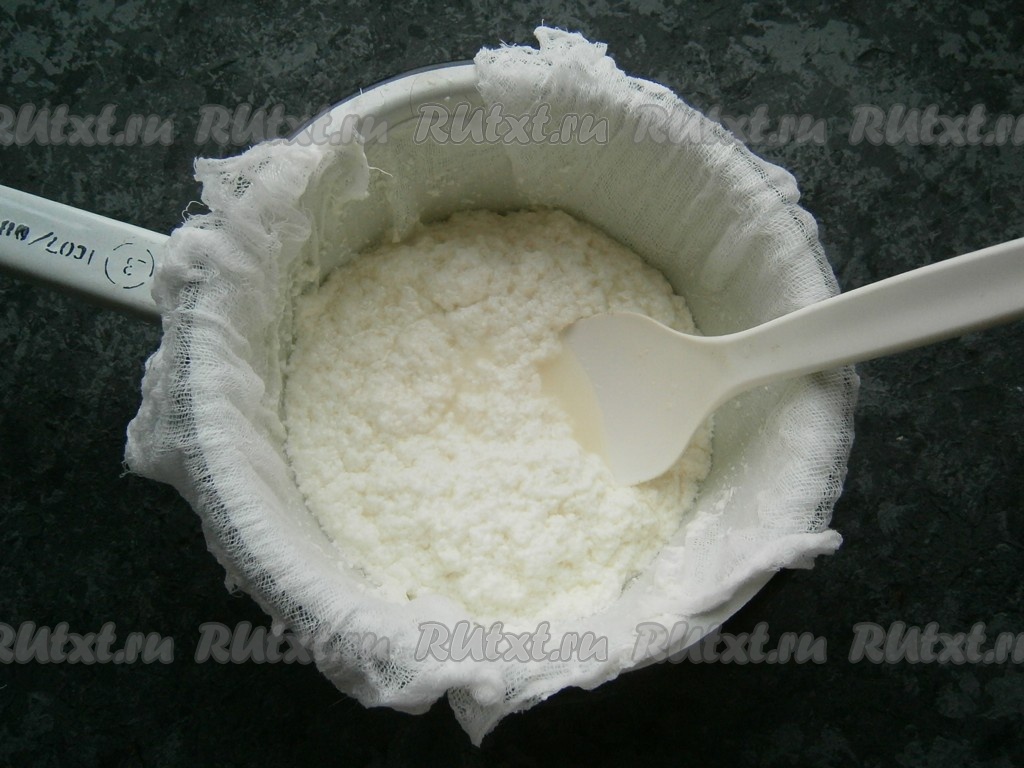 Отцедить творог от сыворотки через марлю, сложенную вдвое или втрое.