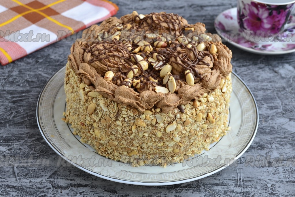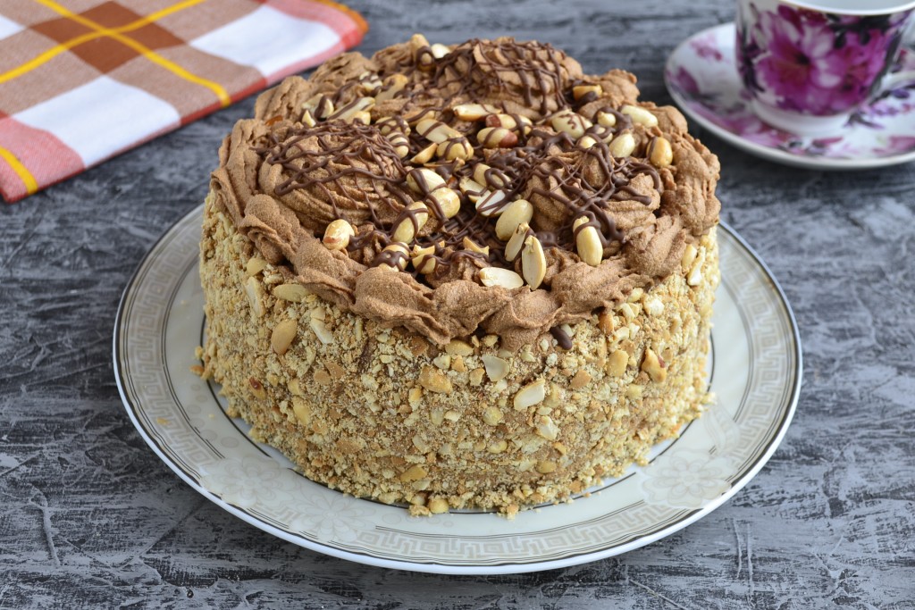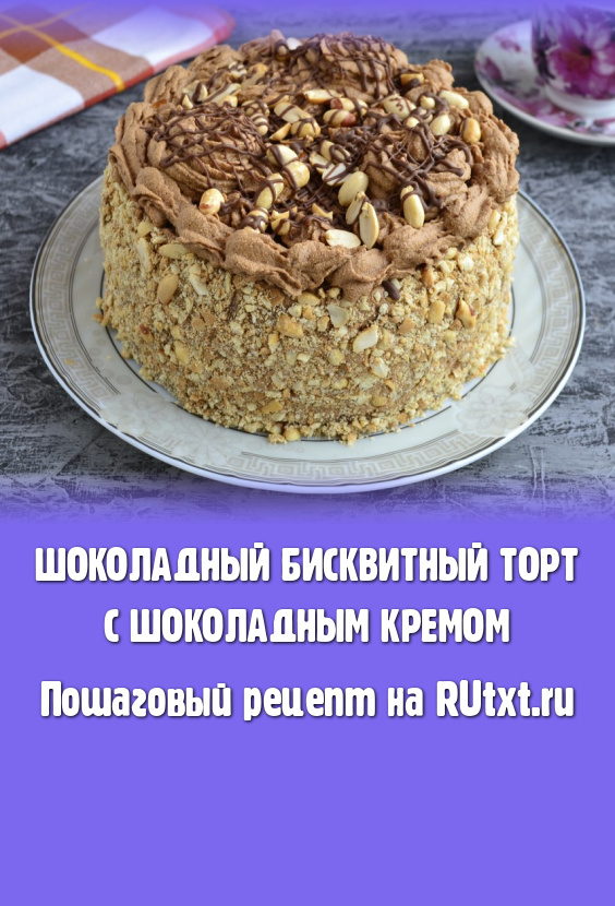 Обсыпать крошкой бока торта, верх украсить арахисом и оставшимся кремом, выдавливая его из кондитерского мешка с насадкой (например, насадкой "звездочка"). Шоколад растопить и нанести сеточку или хаотичные полосы поверх торта. Поместить торт в холодильник на 4-5 часов для пропитки. Вкусный, очень шоколадный бисквитный торт с шоколадным кремом готов!