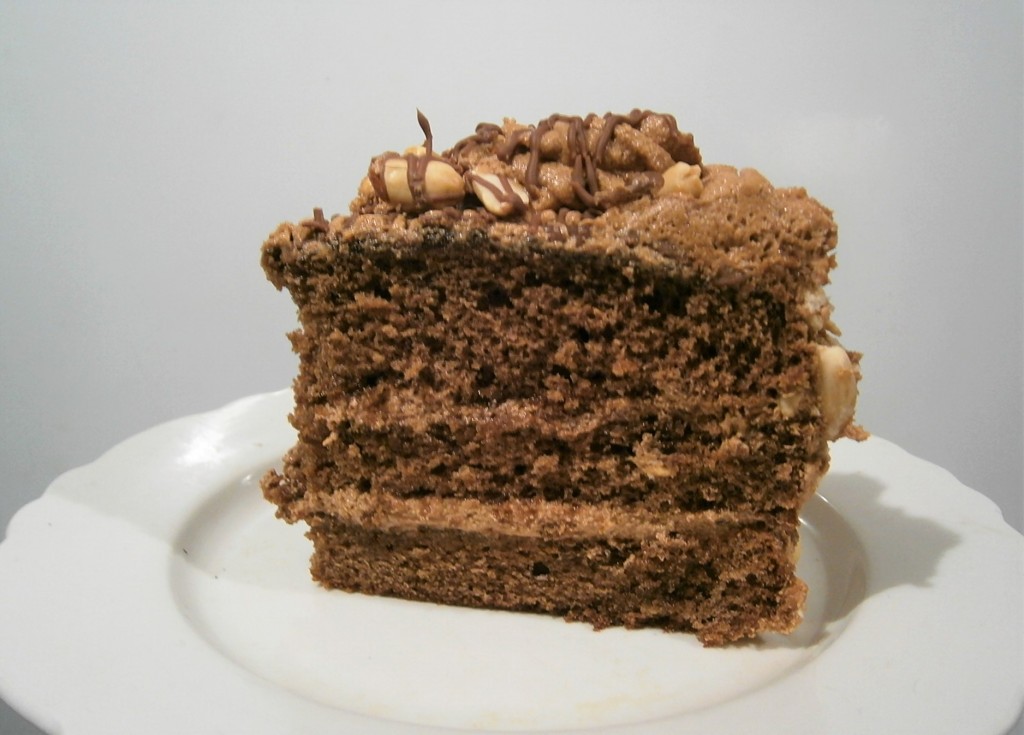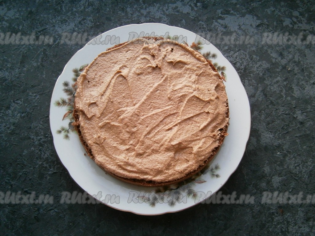 Шоколадным кремом смазать все части бисквита, сложить их друг на друга. Бока и верх шоколадного торта также смазать кремом (немного крема оставить для украшения).
