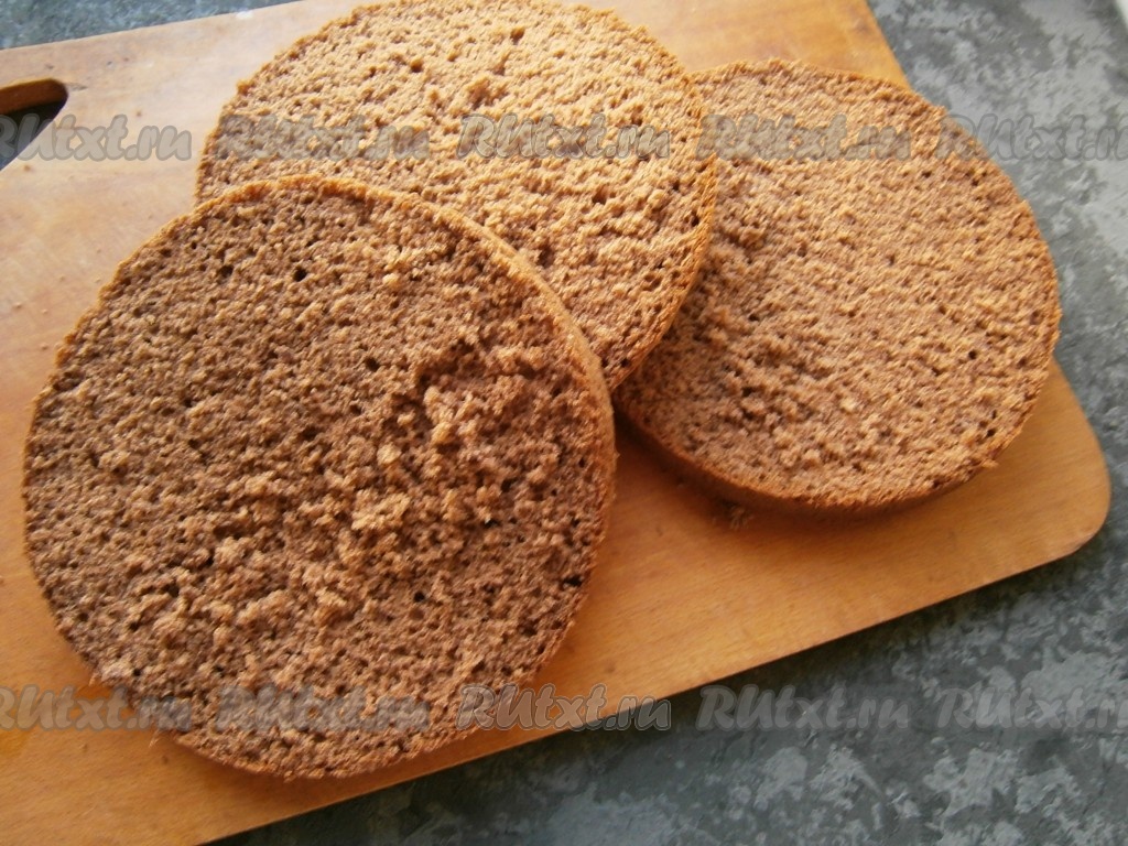 Охлажденный бисквит разрезать на 3 части.