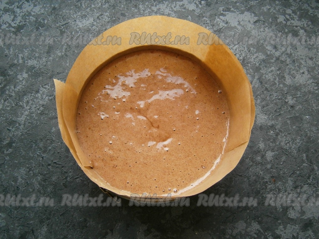 Дно разъемной формы диаметром 20-22 см застелить пергаментом. У меня такой формы нет, моя - чуть поменьше, поэтому я застелила еще и бока, чтобы пергамент был выше формы. Вылить тесто в форму.