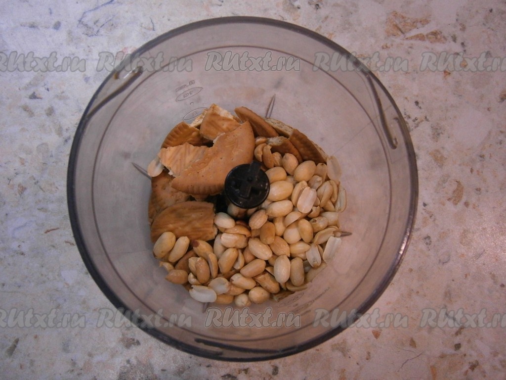 Пару ложек арахиса поместить в чашу блендера вместе с поломанным печеньем, измельчить до крошки.