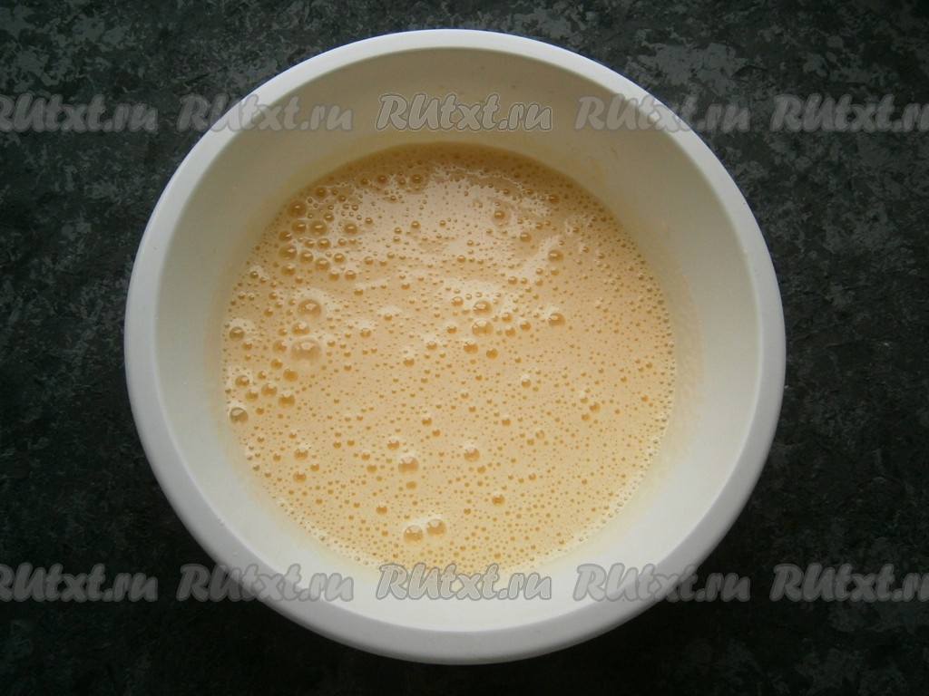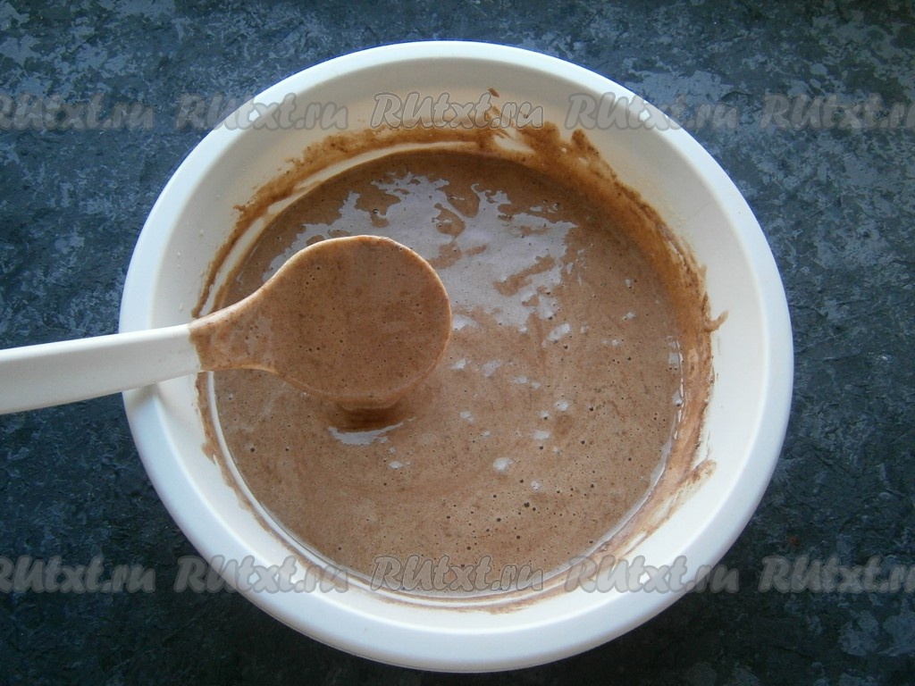 Частями всыпая сухую смесь в яичную, перемешивать тесто ложкой. Тесто получится не густым, похожим на легкий заварной крем.
