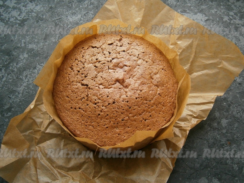 Выпекать бисквит в разогретой до 180 градусов духовке 25-35 минут (до сухой спички). Чтобы бисквит был пышным и ровным, не открывайте духовку 20 минут с начала выпечки. Дать бисквиту немного остыть в форме, после чего извлечь его из нее, убрать пергамент, остудить бисквит на решетке.